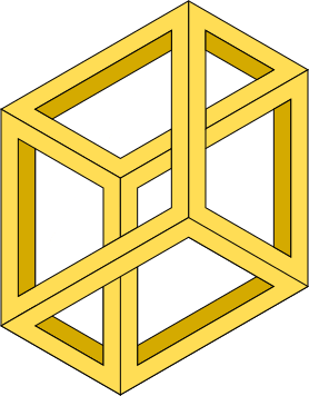 This features a yellow and black geometric shape, which appears to be an optical illusion box. This unique design is created by combining four different shapes into one, making it visually intriguing when viewed from various angles. The combination of the yellow background with the black outlines creates a striking contrast that draws attention to the artistic nature of this geometric shape. Overall, the image presents an interesting and captivating visual experience for viewers.