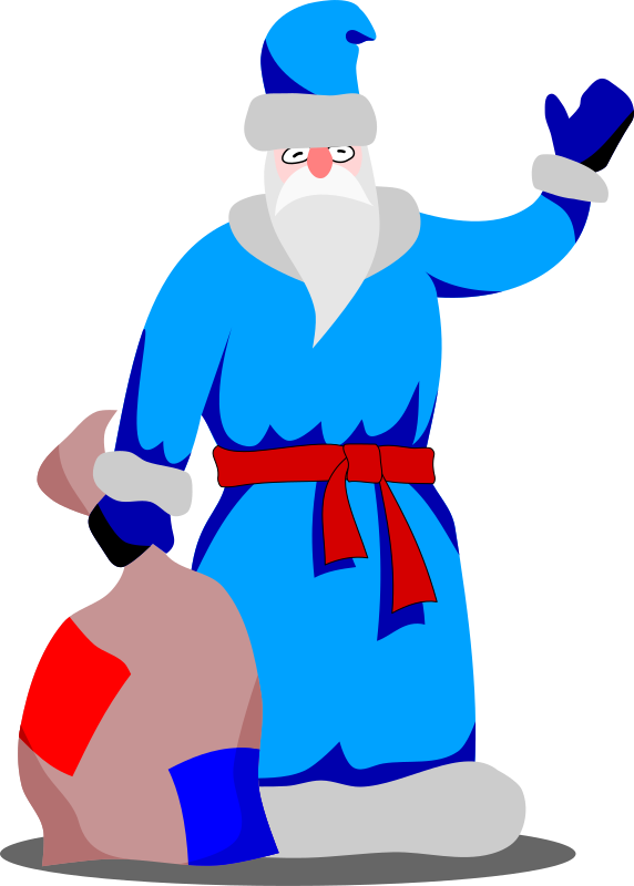 This features a colorful cartoon character, possibly Santa Claus or another jolly figure, wearing a blue robe and holding a bag. This character is standing on the ground with its hand raised in the air, giving off an impression of waving or greeting someone. The vibrant colors and unique design make this image stand out as a creative and playful representation of a festive figure.