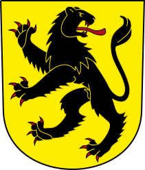 This features a coat of arms with a lion as the main symbol. The lion is depicted in various positions, including one where it appears to be biting its tongue. This coat of arms has a yellow and black color scheme, giving it an eye-catching appearance. The lion's presence on the coat of arms suggests that it might represent strength or courage, as these are common attributes associated with lions in heraldry. Overall, the image showcases a unique and intricate design that captures attention due to its bold colors and striking imagery.